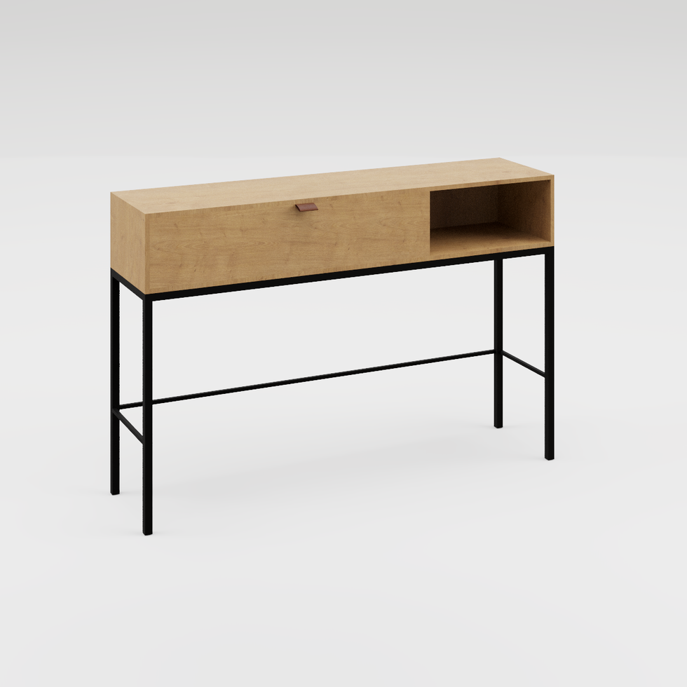 Credenza con estructura de acero electropintado y cubierta de madera y jaladeras de cuero.