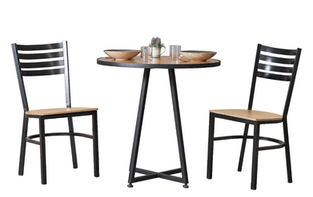 Paquete con dos sillas Artemisa acompañado de la mesa Leonor con canto en solera.