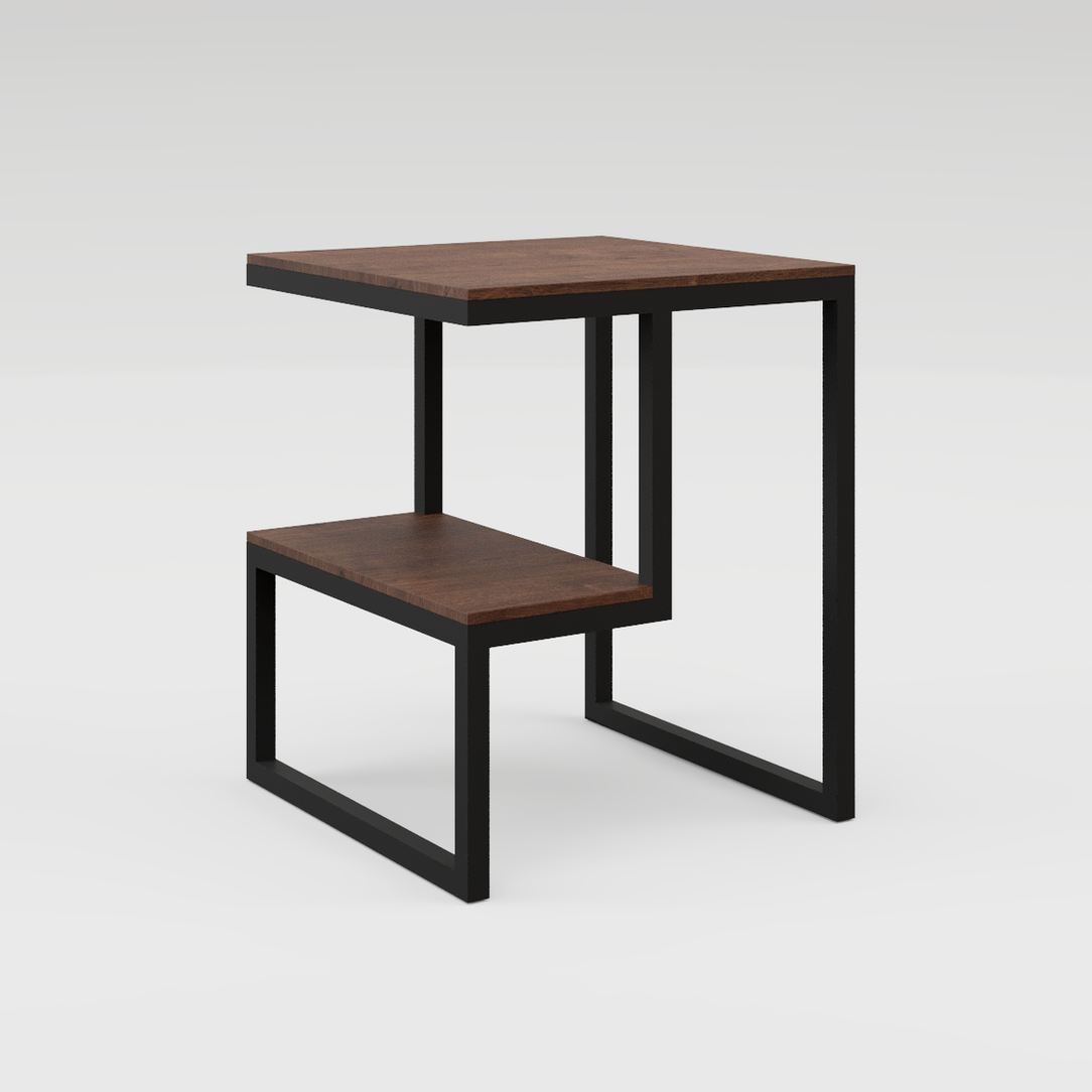 Mesa esquinera con estructura de acero electropintado mate y cubierta de madera.